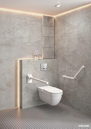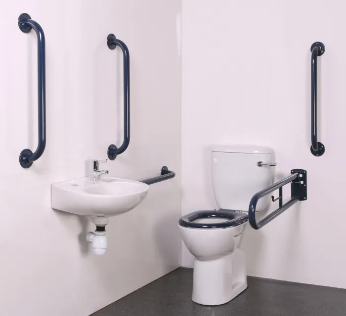 To help aid mobility within your toilet cubicle, grab rails are essential. As well as wall-mounted vertical and horizontal grab rails, at least one drop down rail is needed to the side of the wheelchair-accessible toilet pan. The user will be operating the drop-down rail from a seated position with their back to the rail. Therefore a smooth, easy to use drop-down rail is imperative. It is important to note that the colour of your grab rails should contrast against the walls so that they stand out and are easy to recognise for the visually impaired.