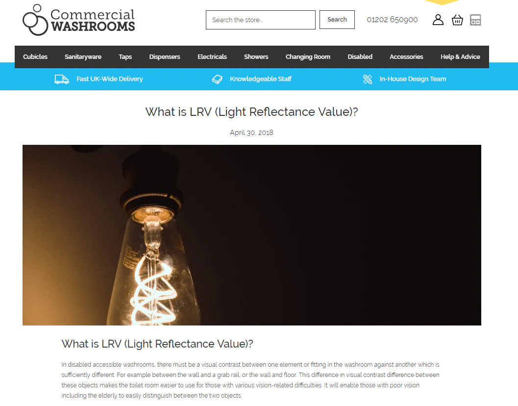In practice comparing LRV values to comply with the regulations will prevent installers from fitting fixtures and fittings on to the fabric of the building where the colours are similar. For example, mounting white grab rails on to white walls which would be too difficult to perceive for some users. For more information on LRV (light reflectance value) please click here.