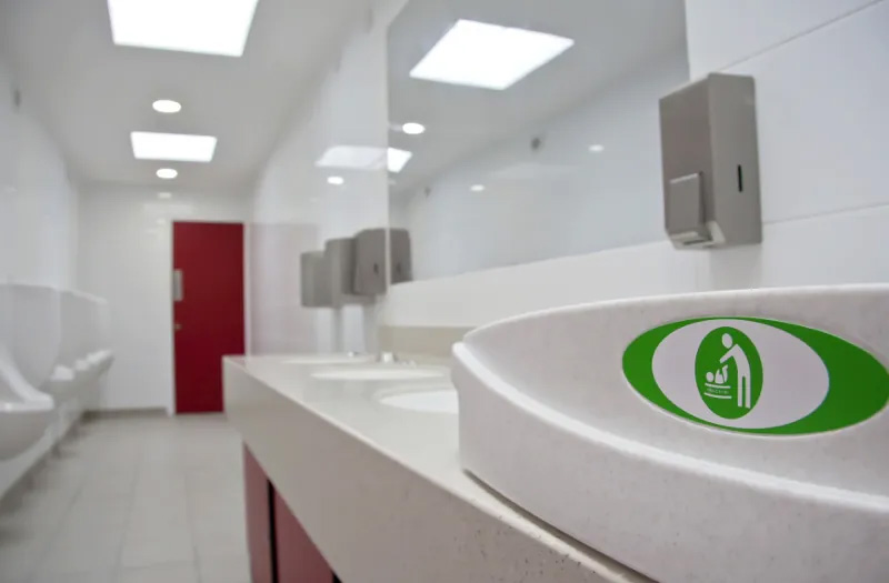 No longer only found in the female washrooms, baby changing trays are now expected in male washrooms as well. Solid surface changing space can be integrated, which is perhaps the most durable option as there are no moving parts and fits the end of a vanity unit or countertop. Traditional fold down options are also widely used in public toilets and are often either located on the wall near to the sink and waste bin or in the disabled toilet above the toilet pan itself.