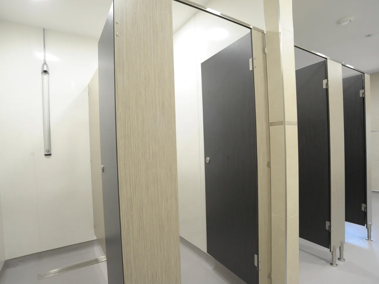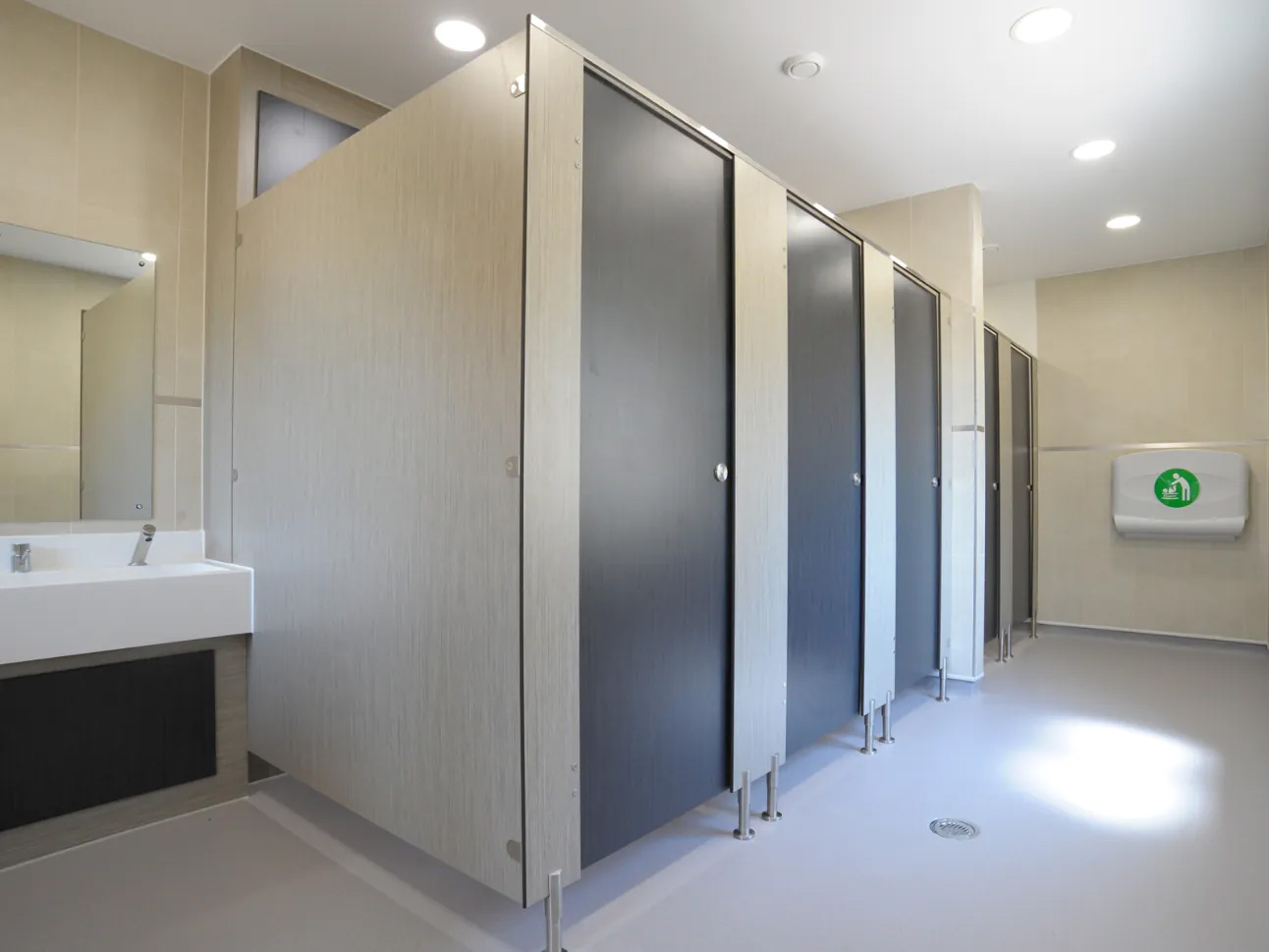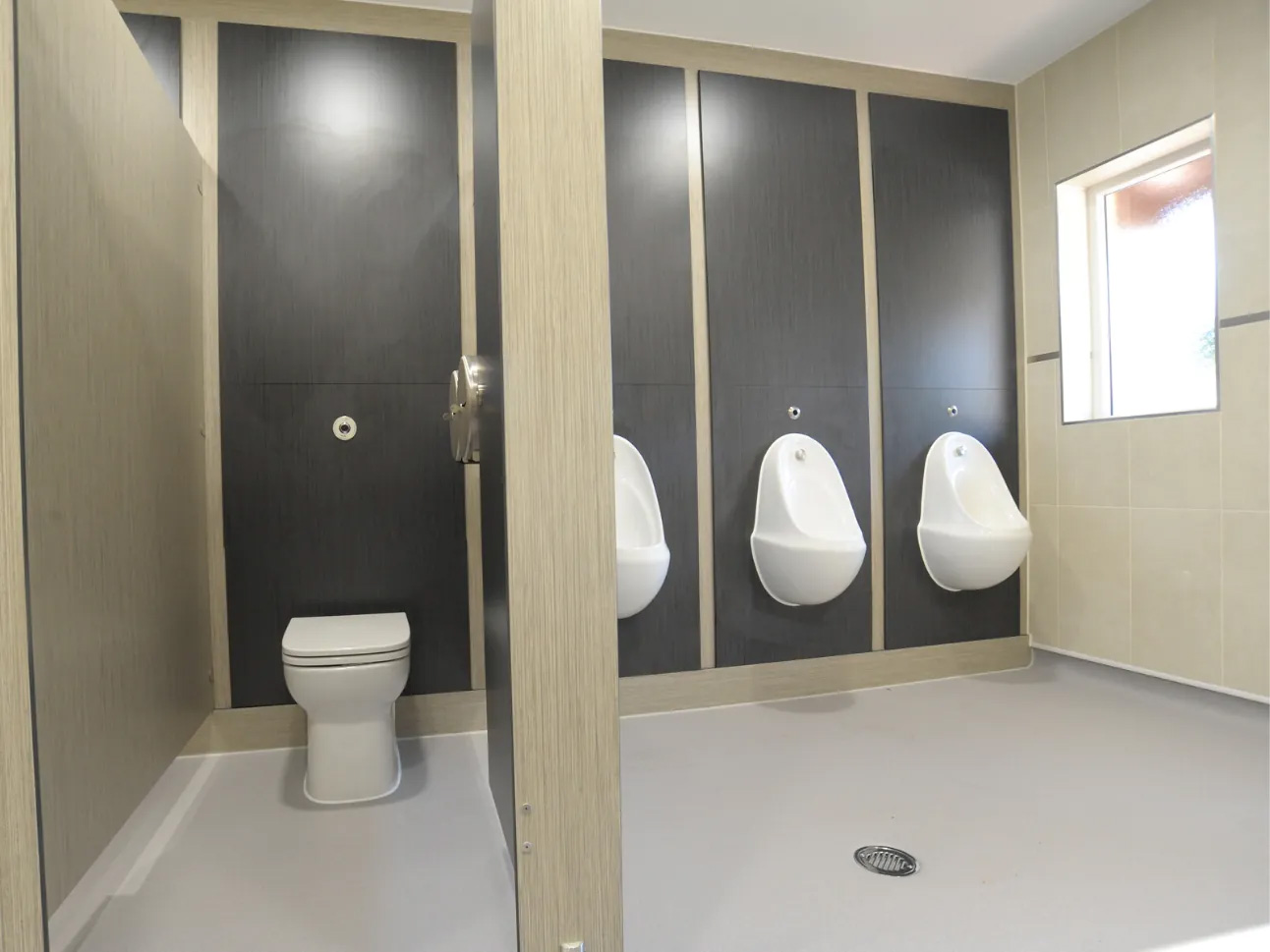 We installed Delabie Sporting shower panels, a model that offers both shower head and controls in a single neat unit, making future maintenance easy and simple. Cubicles were made from solid grade laminate, a material completely waterproof. This material was also used for the toilet cubicles, as well as cladding the DUCT sets used to house all the cisterns and associated pipework for the toilets and urinals.
