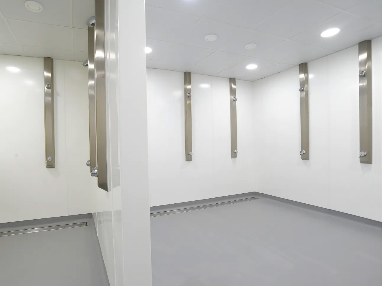 Bristan shower panels were employed that featured integral thermostatic mixer valves. These units allow for easy maintenance, but also give the user full control over shower temperature. The shower drainage was completed with Aco floor gullies designed to accept vinyl flooring. The Altro Aquarius is then welded into the edge of the gulley, delivering a reliable water-tight seal.