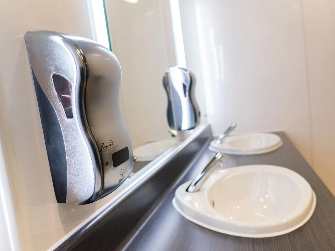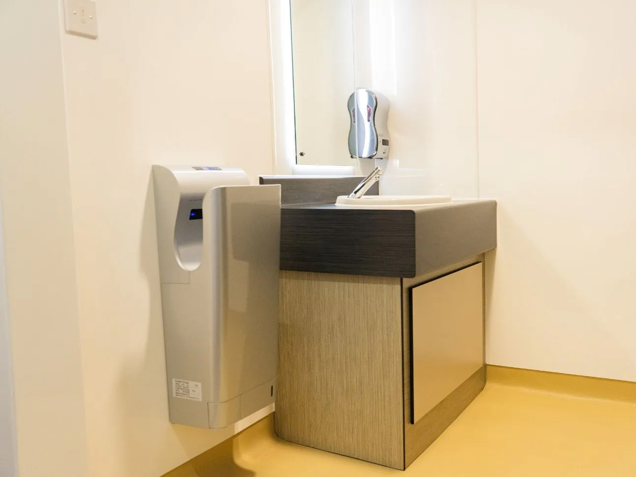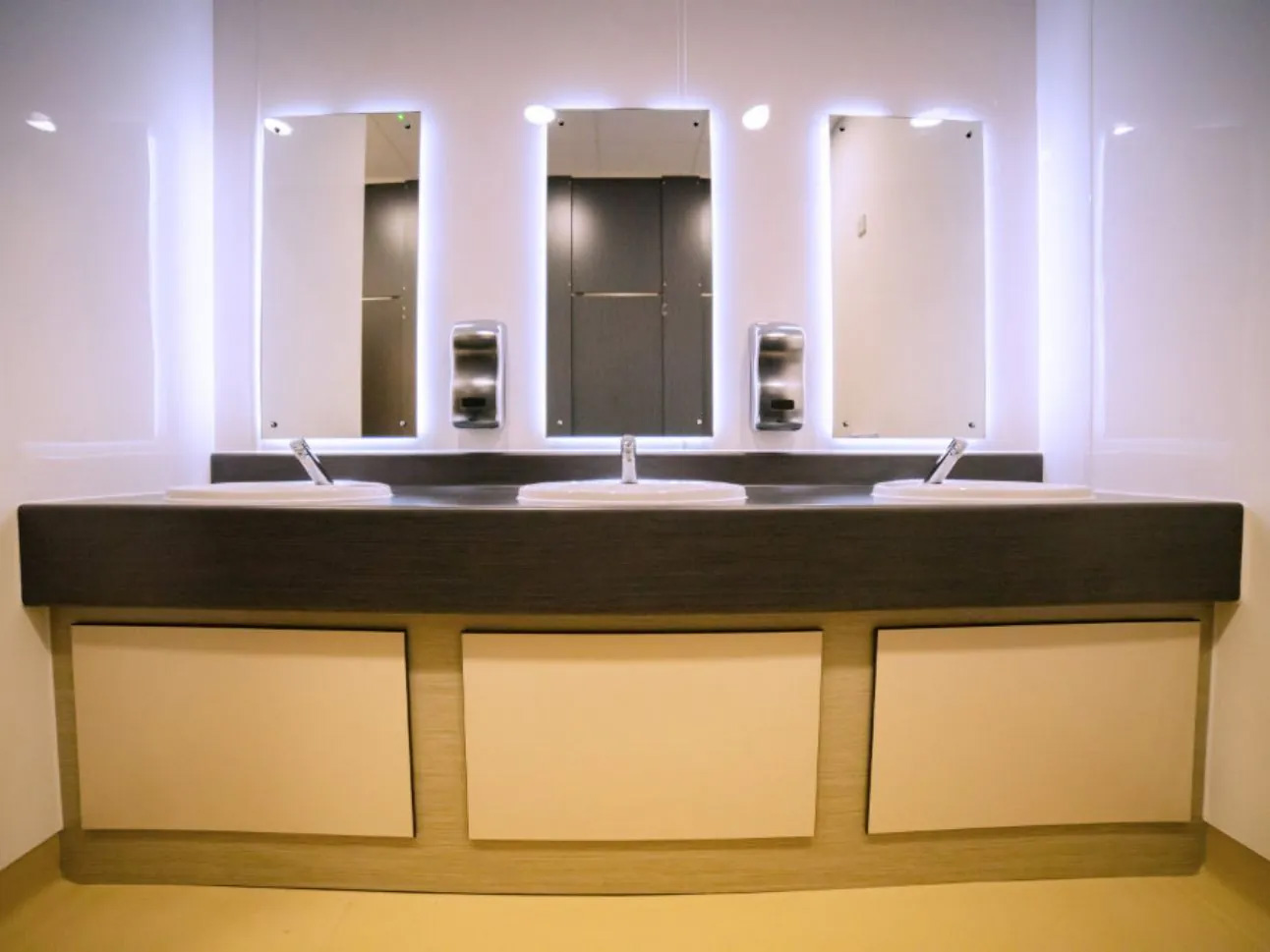 Bespoke Vanity Units were constructed from an SGL under-frame, carrying ceramic washbasins and Delabie Temposoft 2 taps. These taps have a softer touch operation, which makes them easier for children to use, while only emitting water for a set period of time. This delivers a saving on water usage but also prevents taps from accidentally being left on. To complete the hand wash area, we installed bespoke LED backlit mirrors above each washbasin.