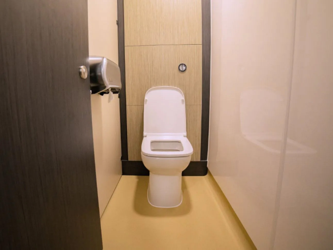 Following the existing layout, we fitted integrated plumbing systems for the toilets, hiding all pipework and cisterns within a Solid Grade Laminate duct set that sat behind each cubicle. Full height cubicles were installed to deliver a modern feel to the washrooms. These were made from Solid Grade Laminate due to their highly durable nature, being completely impervious to water. Vitra S20 back to wall toilets were installed within these cubicles along with push-button controls fitted into the back wall panel.