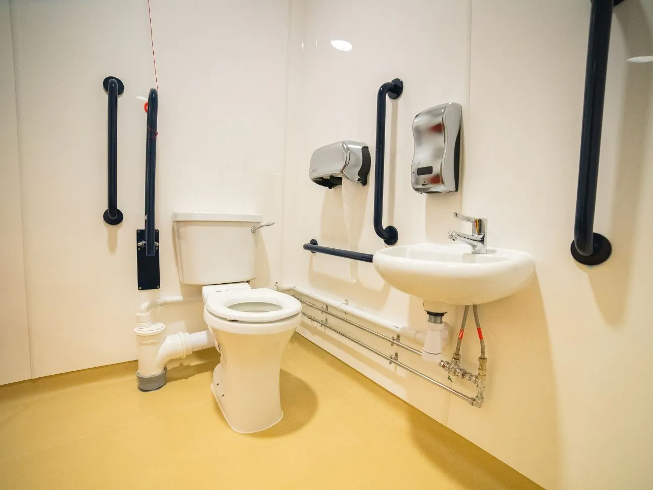 Within the disabled washroom, we fitted a Close-Coupled Doc-M Toilet Pack, which has everything needed for a fully compliant disabled room. The grab rails were blue so that they contrast against the wall colour as this helps the visually impaired.