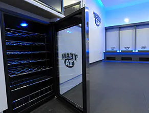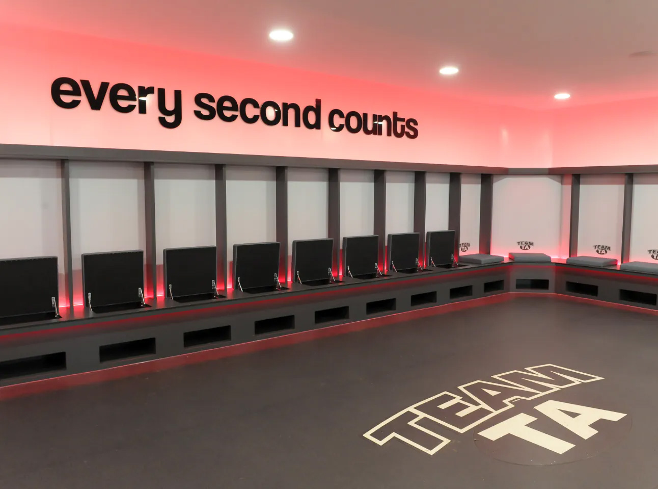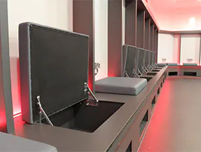 Beneath the screen in the changing area, we created a custom cupboard system that housed a drinks fridge in the centre, as well as storage for the Bose subwoofer, and storage for the personal tracking chips players wear during gameplay. A solid surface worktop completed the unit, and a professional game-play countdown clock was mounted above the TV screen.