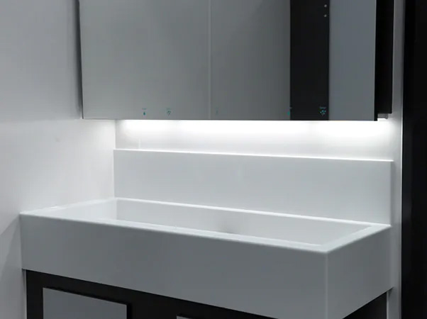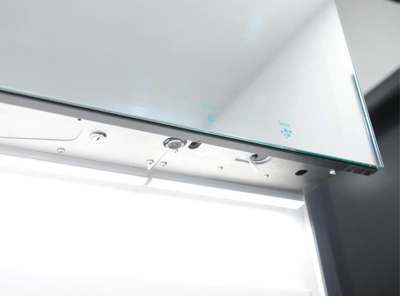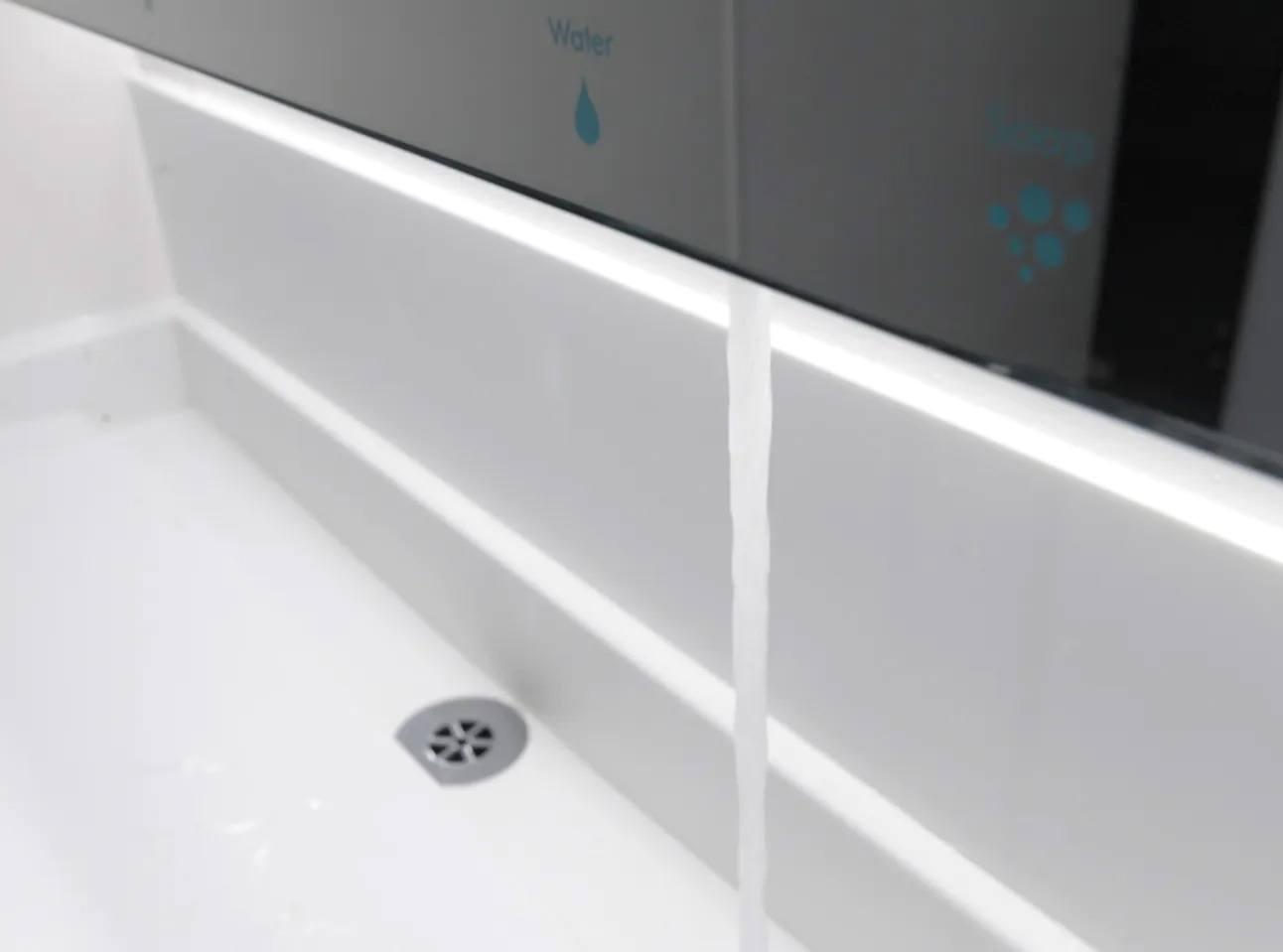 Within the right-hand room, where the toilets and showering facilities are located, we installed a Dolphin Alavo system, which is a wall-mounted mirror cabinet that also houses soap, water and hand drying functions, all operated by sensor activation. This unit was installed above a solid surface wash trough for wider communal usability. Meanwhile, in the empty space in the middle of this room, two spinning bikes were installed for players to warm up and cool down around game-play.