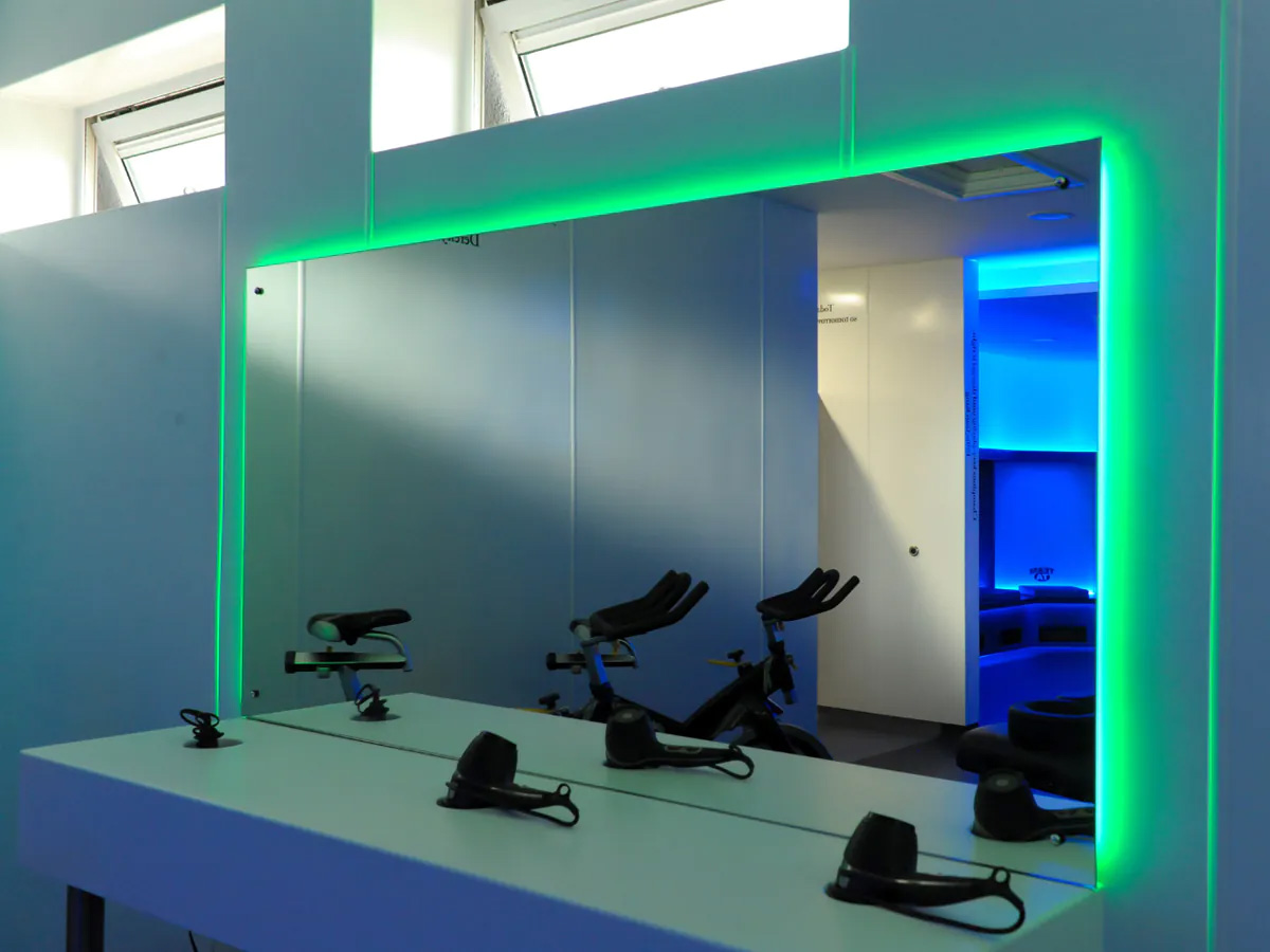 Between the rooms, we built a partition wall with open access on either side. This wall holds two 72-inch touch screens for game analysis, one facing the changing room, the other facing the two spinning bikes.