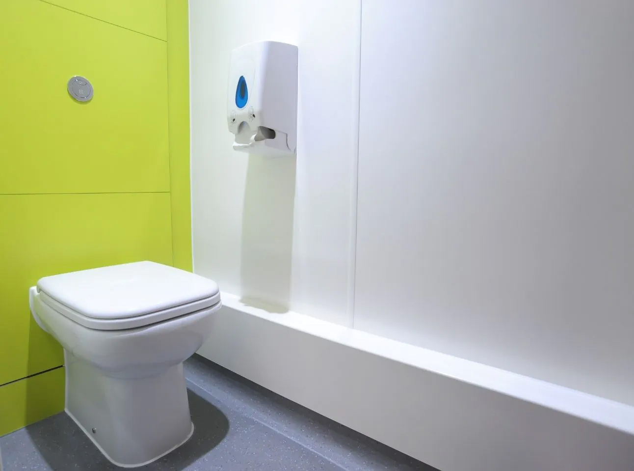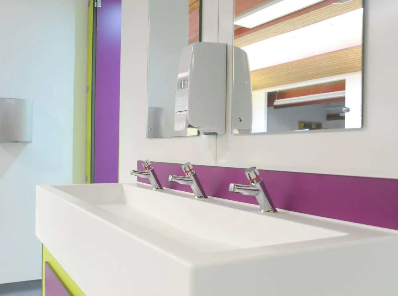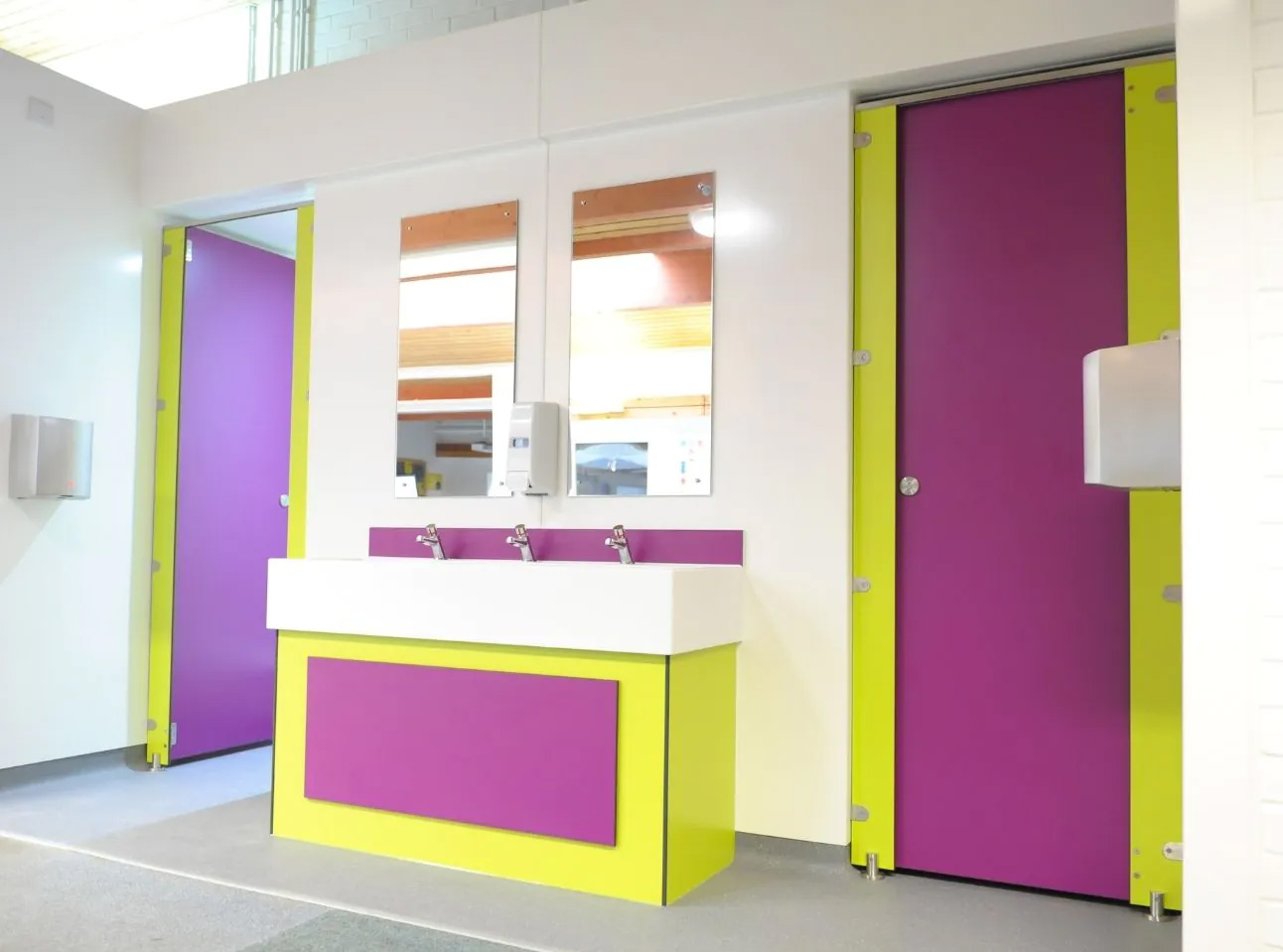 The decision was made to use white solid surface wash troughs, which were mounted on a custom vanity unit underframes constructed from solid grade laminate, a highly durable material that’s completely impervious to water so will never swell or weaken from ingress water. The school chose to go with a bright and engaging colourway of lime green and purple, which helps to give the washrooms a more modern and vibrant aesthetic.