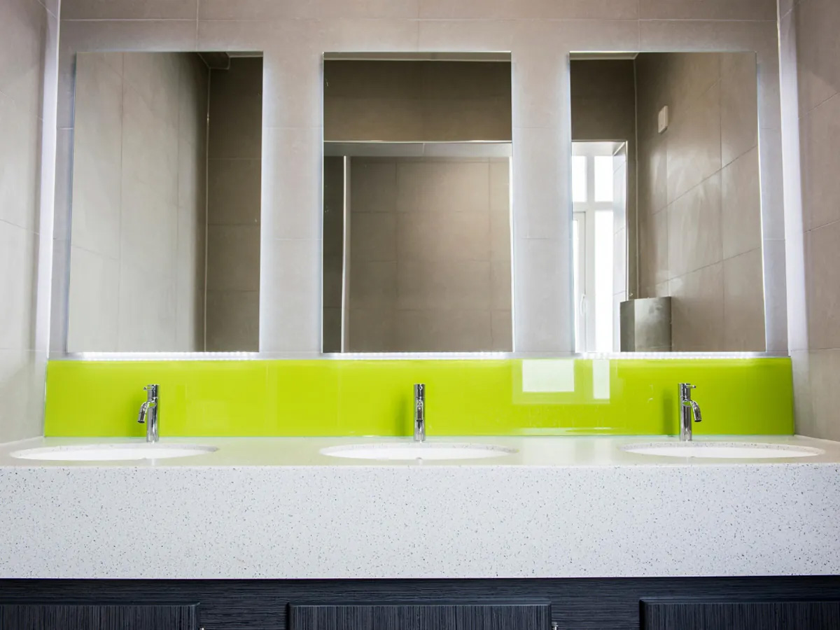 Grouting between wall tiles is an area where bacteria can build up and requires regular, thorough cleaning. The large wall tiles selected reduce the amount of grout needed, resulting in improved hygiene and an easier to clean washroom.