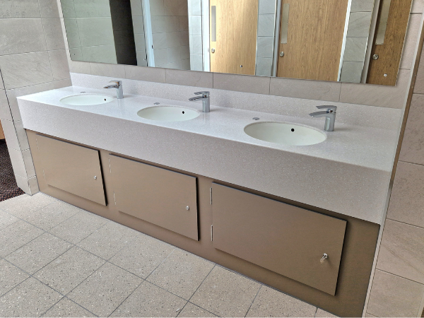 The new vanity area was created with a bespoke solid-grade laminate underframe that featured hinged, lockable panels on the front. This unit carried Corian, solid surface countertop with pre-formed Corian washbasins. Lever taps were used at the washbasins, and a large landscape mirror above the unit that spanned the width of the vanity unit.