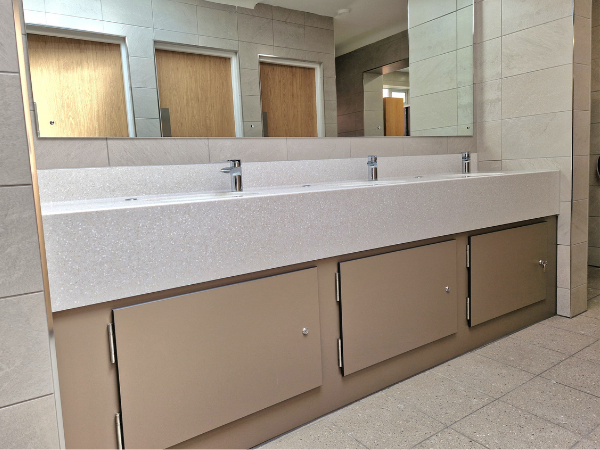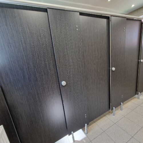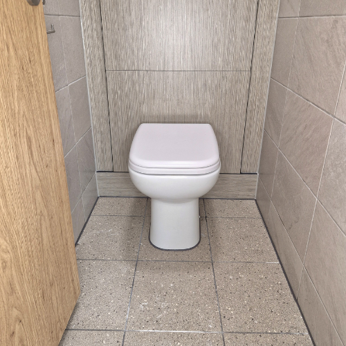 The toilet rooms were fitted with an IPS duct system behind the toilet, a unit that conceals all the pipework, waste and cistern in a false wall, delivering a clean, minimalist finish. These toilets were also paired with sensor-activated flush kits to improve usability and hygiene in the washroom. The cubicles were also upgraded with new oak veneer doors.