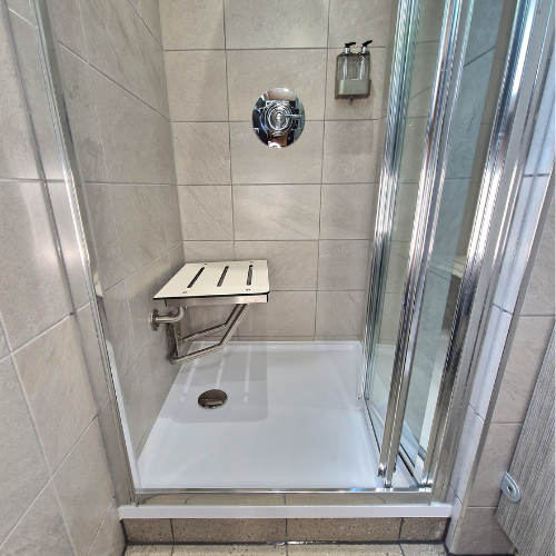 By constructing stud work, we were able to conceal all the shower plumbing within the wall, so that only the shower controls and the rain shower heads, which deliver a more luxurious showering experience, were visible to the user. Bobrick folding shower seats were also installed in the shower to provide additional stability and support for those who require extra assistance when showering. To finish, we fitted stainless steel shampoo and shower gel dispensers, which can be maintained and topped up by the cleaning staff at Ferndown Golf Club.