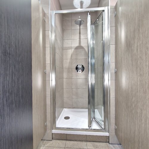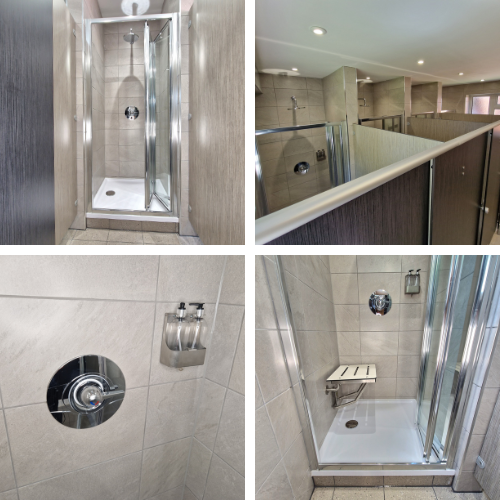 The existing vanity unit area in the washroom was underutilised, and we were briefed on making better use of the available space. We relocated the showers to the vanity area, which required installing new mains water feeds and waste drainage. The four shower trays were sited and separated by custom-built stud walls and screened with a glass shower screen.