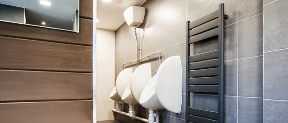 Perhaps the most traditional type of heating in the washroom, radiators are great at heating rooms providing they have the correct BTU (British Thermal Unit) output for the space they’re in. This is worked out by calculating the cubic volume of the room, and then making adjustments for things like hard floors, windows and humidity levels derived from things like sinks, toilets and urinals. This will vary from site to site, so please get in touch if you would like to discuss radiator and towel rail options in your washroom.