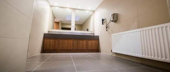 This is a method mainly used in high-end members' clubs but is an effective method of heating. In areas where users will be moving through the room barefoot, such as showering spaces, this is an effective method of heating. This type of heating can be a little more complicated and expensive to install but is primarily used in environments such as golf and country clubs.