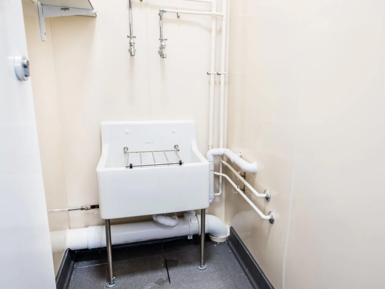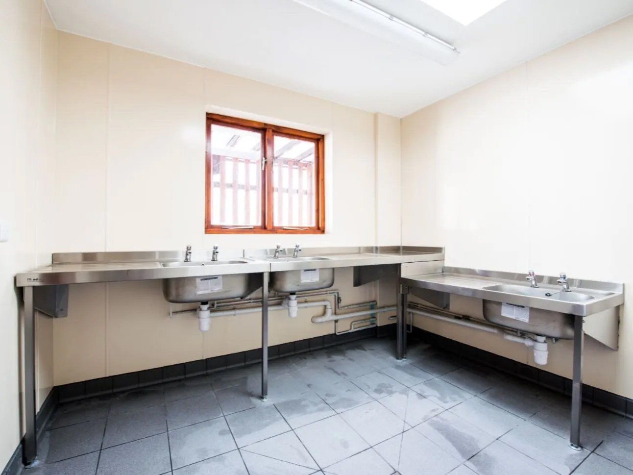 In the reception building, we built a custom counter with high-pressure laminate (HPL) worktop and frontage. New PVC windows were also installed, along with Altro Walkway vinyl flooring. Out the back, a staff wash and shower room were renovated with the inclusion of a Belfast butler sink for cleaning duties.
