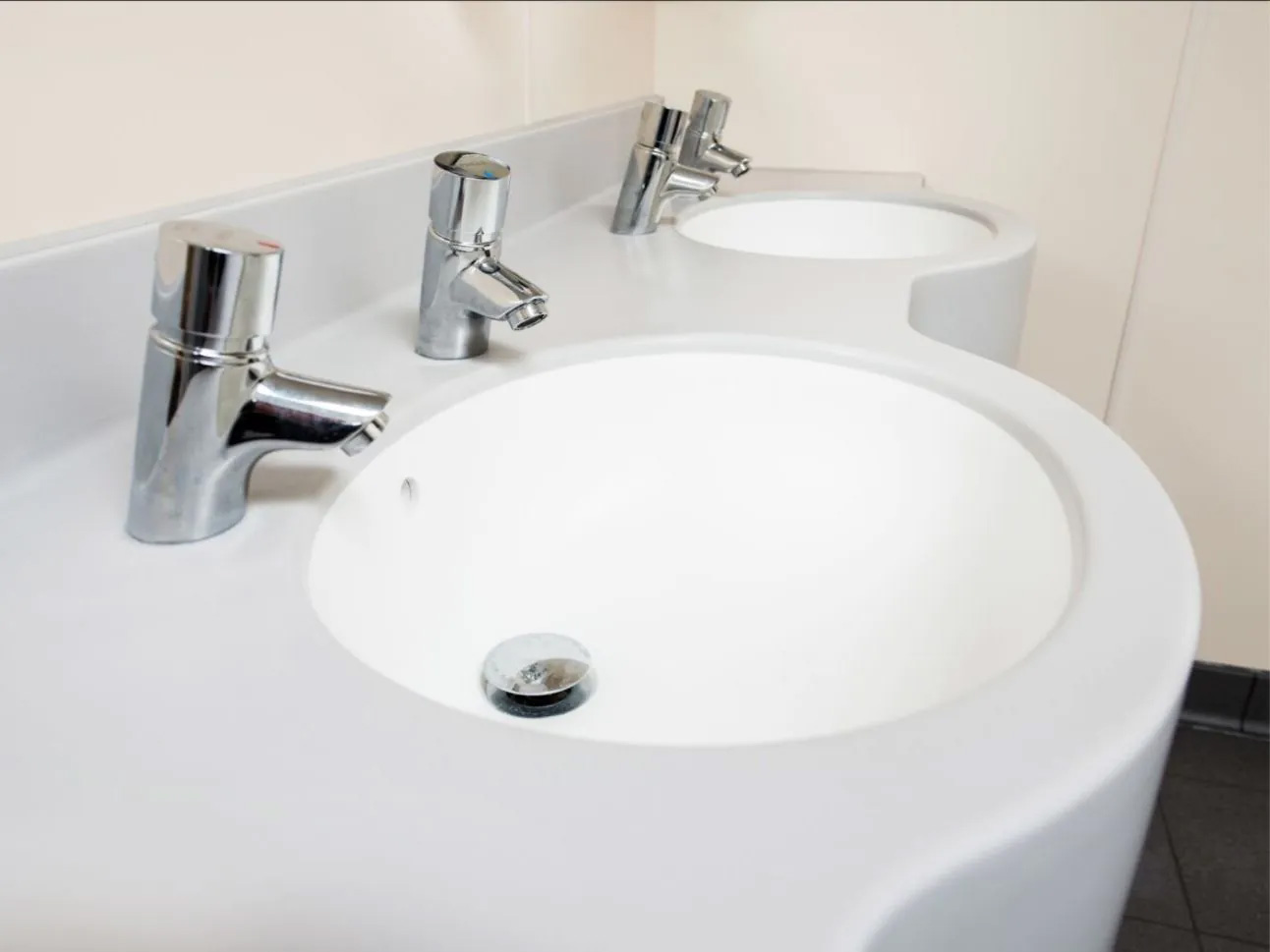 To prevent water accidentally being left on, we used Armitage Shanks Avon thermostatic push taps throughout the site. These taps also delivered warm water at a safe temperature so users can't scald themselves. Sinks and vanity tops varied across the site, including solid surface Corian units with integrated moulded washbasins, traditional inset vanity tops and some semi-recessed options where space was slightly restricted.