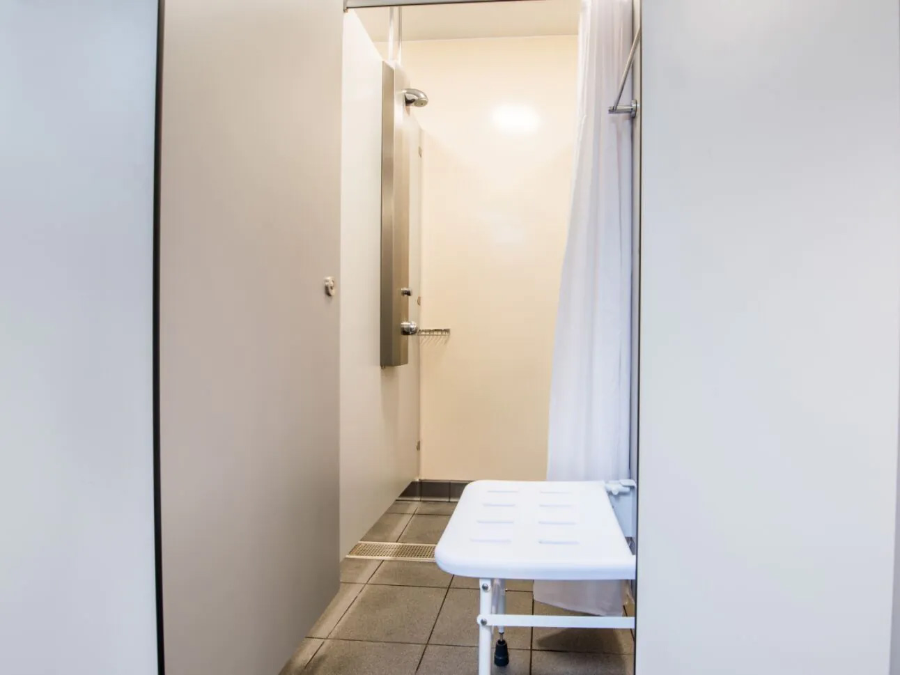 Each shower cubicle included a changing space, shower curtain and shower gel holder and drained into Aco floor drains. A family room was also created, including a baby change unit, toilet and dedicated hand washbasin.
