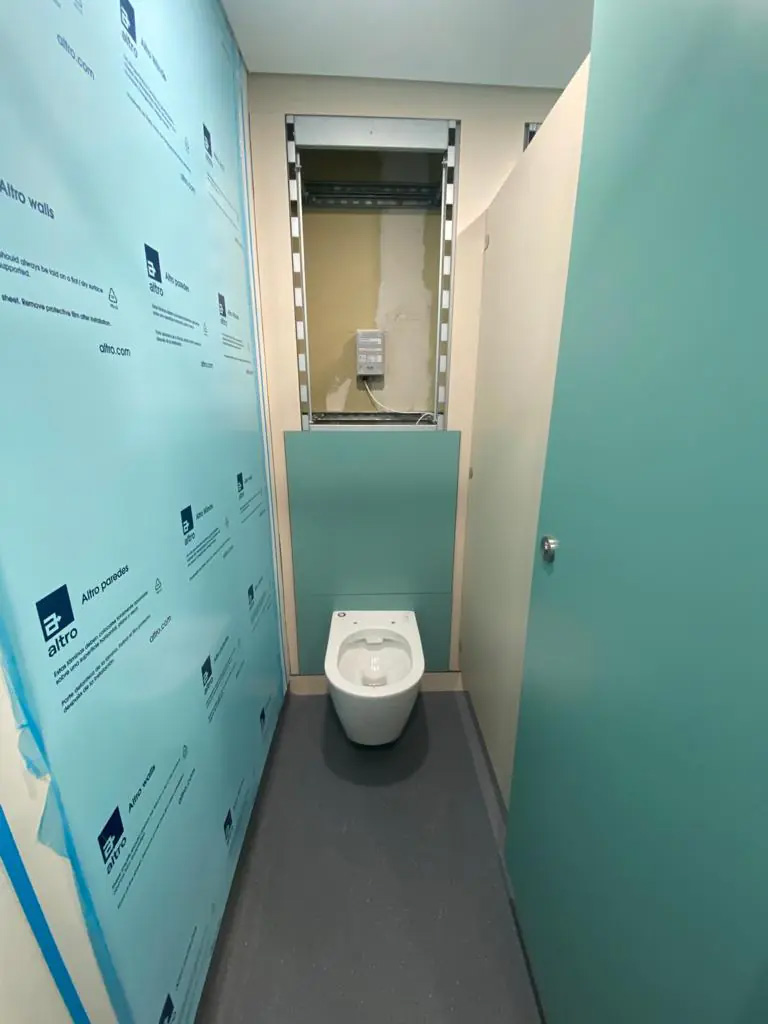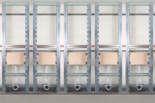 Before hanging your toilet pan, you need to ensure they are marked out evenly and spaced to allow for the cubicle enclosures that will be installed later. Once you have double-checked your measurements, you can attach the fixing rods that will carry your wall-hung toilet pans.