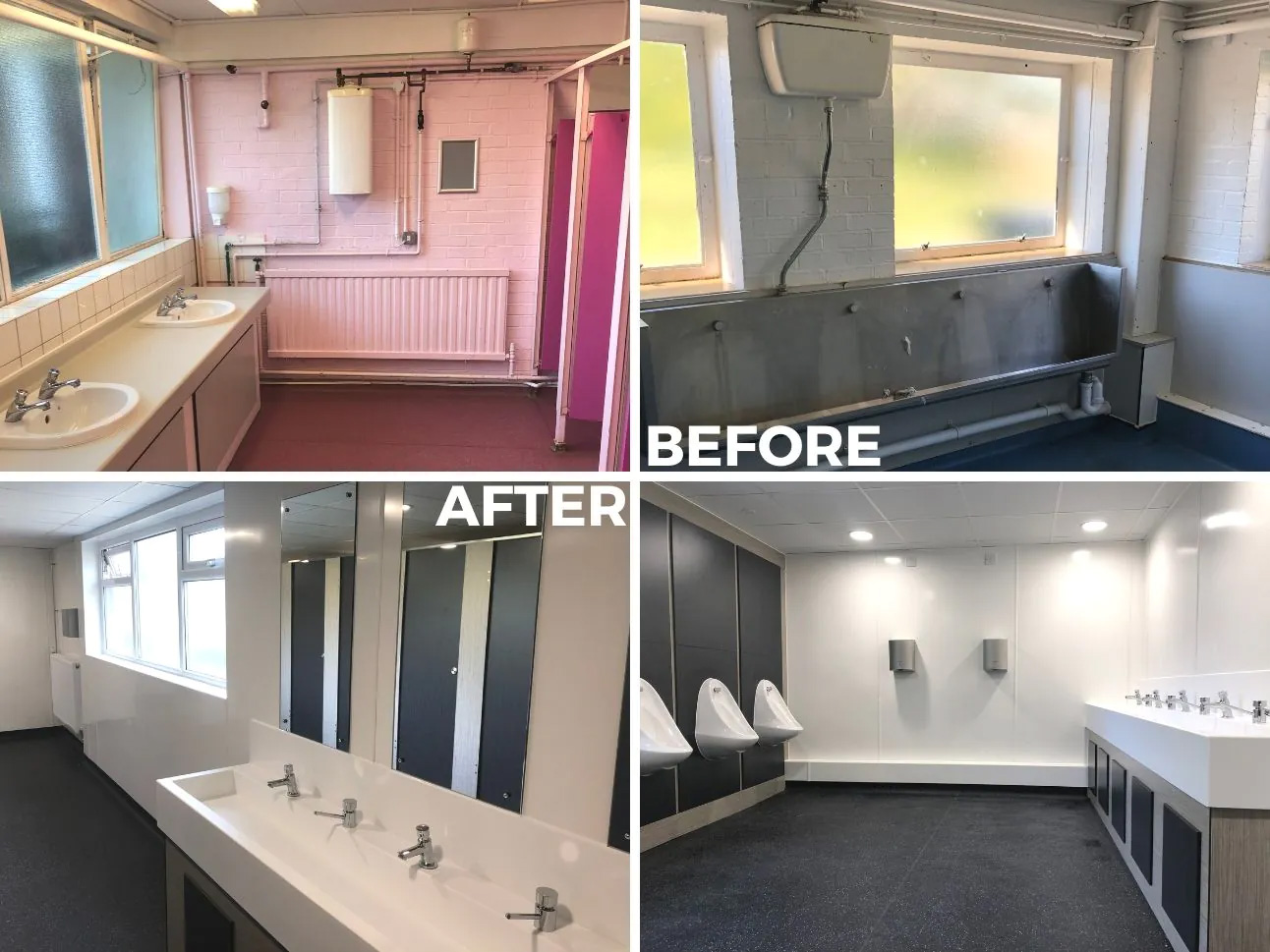 We were contacted by King Arthur’s School in Wincanton, Somerset to redevelop four student washrooms. As well as being very outdated and in poor condition, the washrooms had received several small remedial works over the years, resulting in a washroom that was full of surface-mounted services like pipework and electrical conduit.