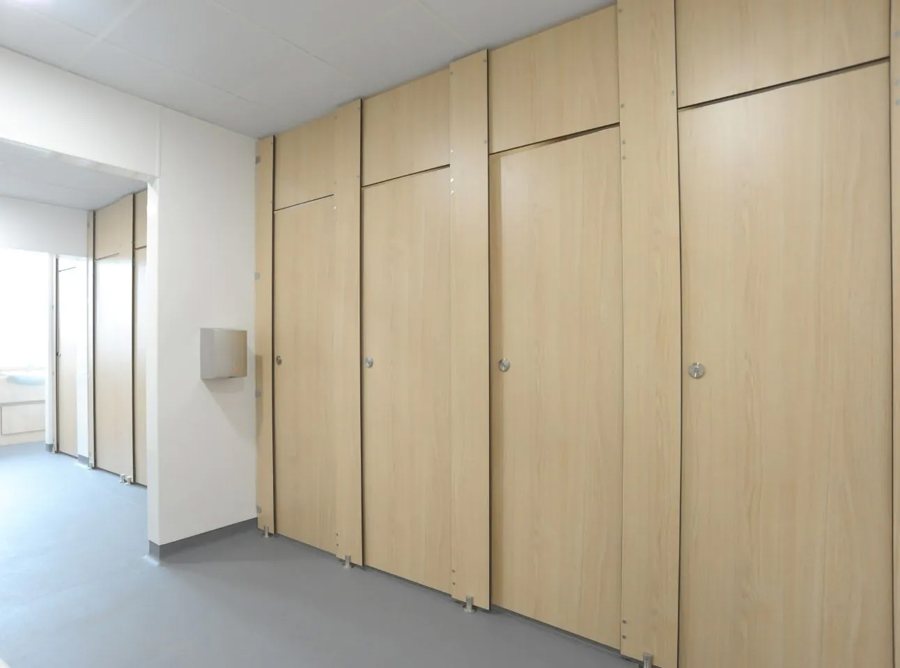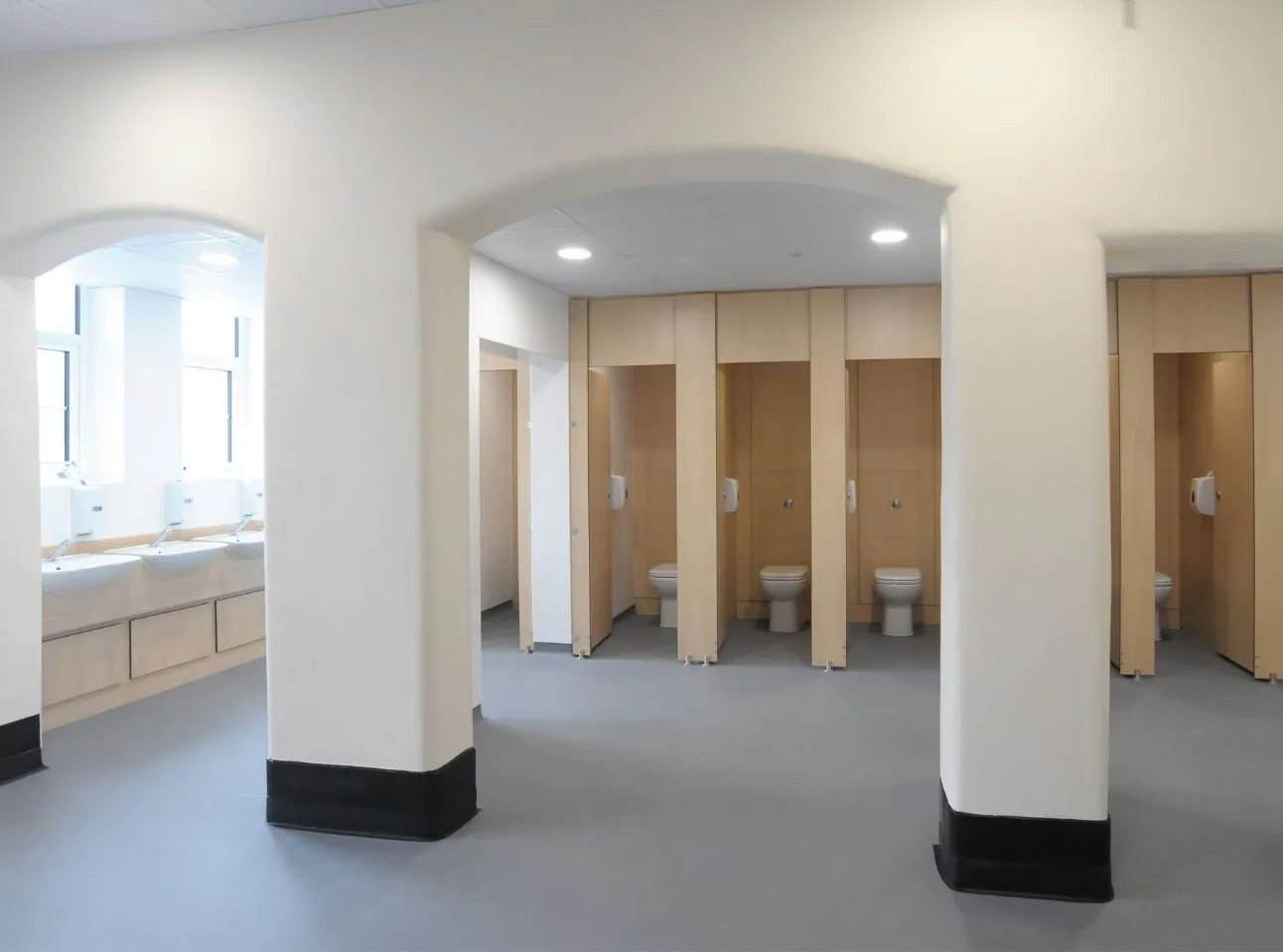 The building had a lot of traditional archways that had been blocked up over the years to separate the rooms. We started by removing these to expose the large solid archways. Full height toilet cubicles were then installed, a strong move in anti-bullying but also to deliver increased privacy in a unisex wash space. The school went for a light wood grain effect on the solid grade laminate panels, which gave a warm, rich finish to the wash space.