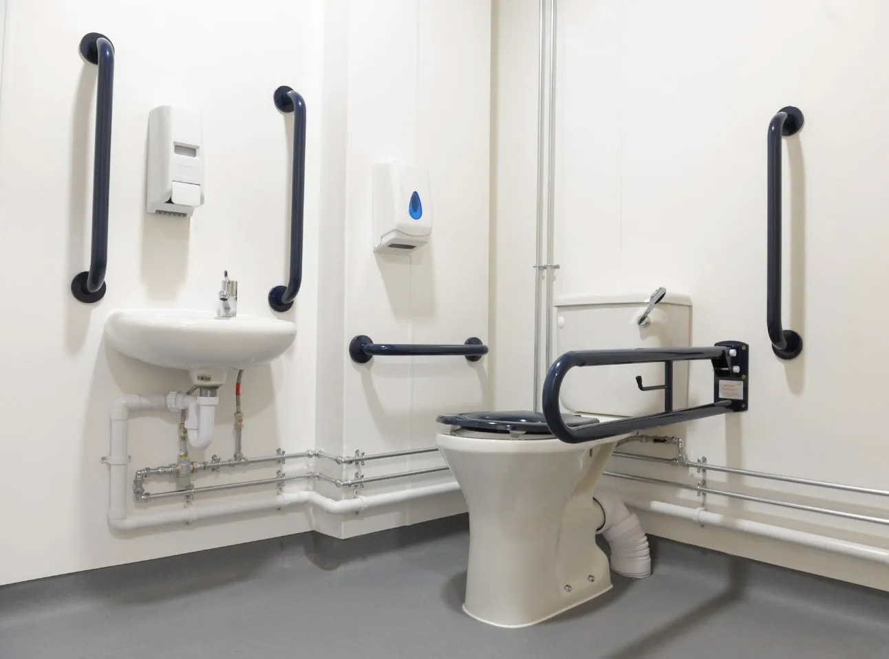 In the staff washrooms, the disabled enclosure was constructed from solid grade laminate panels and fitted with a full Doc-M pack with a close coupled toilet, including blue grab rails that contrast against the wall colours.