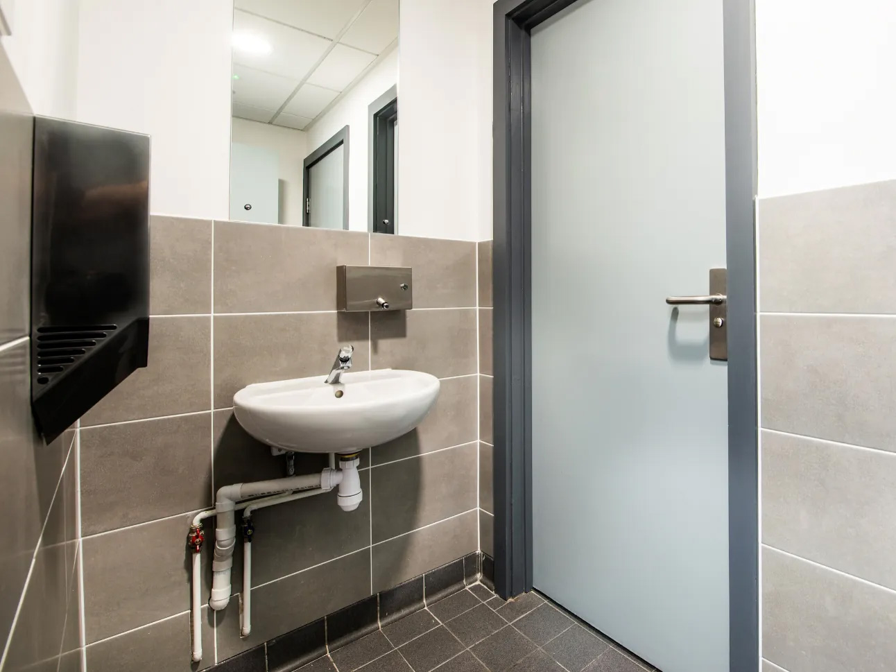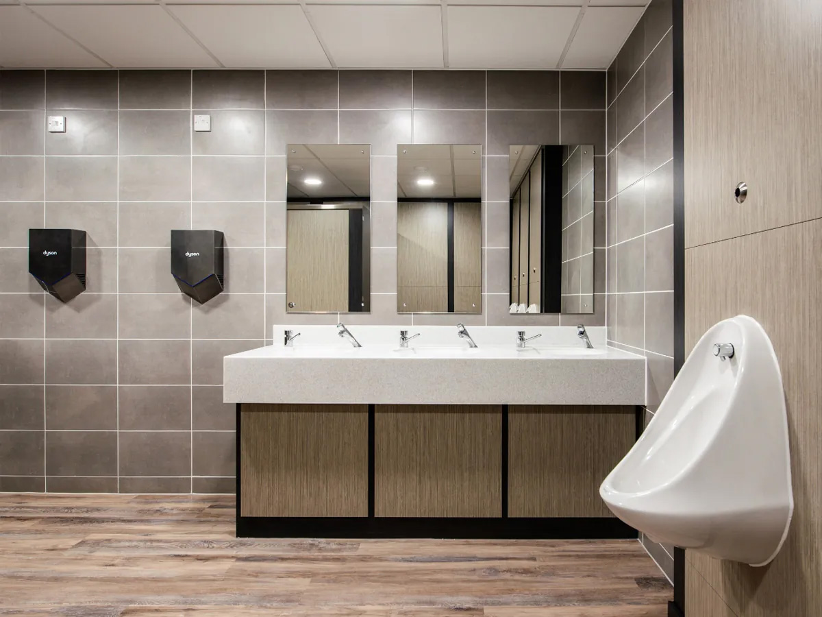DVS sensor flush kits were used alongside the Twyford Spectrum urinals to deliver water-saving and hygiene benefits to the washroom. Within the cubicles, we installed Vitra S20 back to wall toilet pans, while at the hand wash area Franke Pureline self-closing taps were partnered with solid surface vanity tops with moulded washbasins.