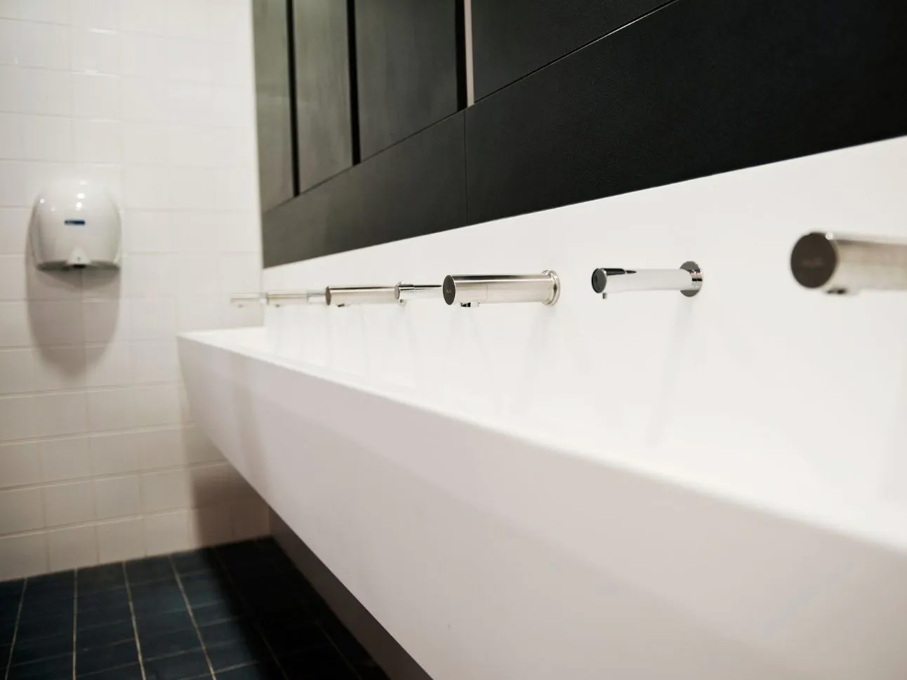 The final outcome achieved all of the market’s requirements. Commercial Washrooms supplied modern speckled dark grey toilet cubicles and partitions. Contemporary solid surface wash troughs with panel mounted sensor taps, and high use anti-vandal toilet pans.