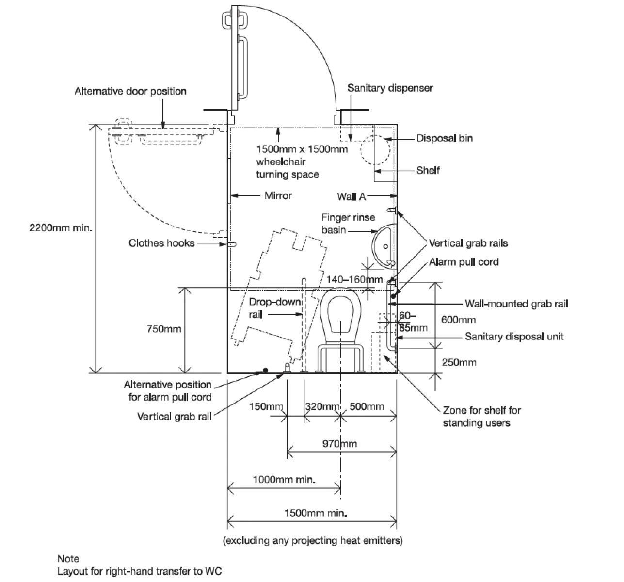 Guidance on how to achieve the necessary wheelchair manoeuvres to transfer onto the toilet, to have facilities for hand washing and drying within reach from the toilet, and to have space to allow a helper to assist in the transfer from WC to a wheelchair is provided in BS 8300 para 12.4.