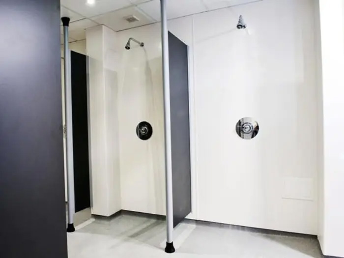 In a communal shower space, showers are located at a minimum of 750mm centres. This gives each user ample space to shower comfortably. Within this space, there are options for small dividers or shower screens to be fitted between each shower, sometimes made using frosted safety glass, or solid grade laminate (SGL).