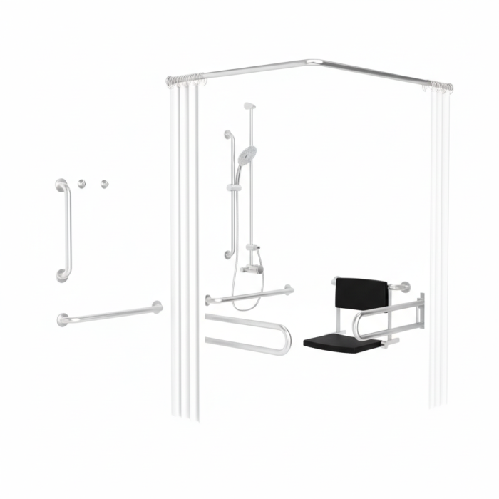 The pack includes a shower seat and back support, stainless steel grab rails, hinged rails, concealed thermostatic mixer, two-way diverter, handheld shower head and flexible hose, alarm and pull cord, to provide you with a complete showering solution.